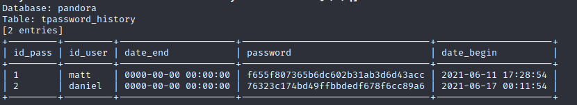 After enumering through the pandora database, i found 2 interesting tables, tpassword_history and tsessions_php.